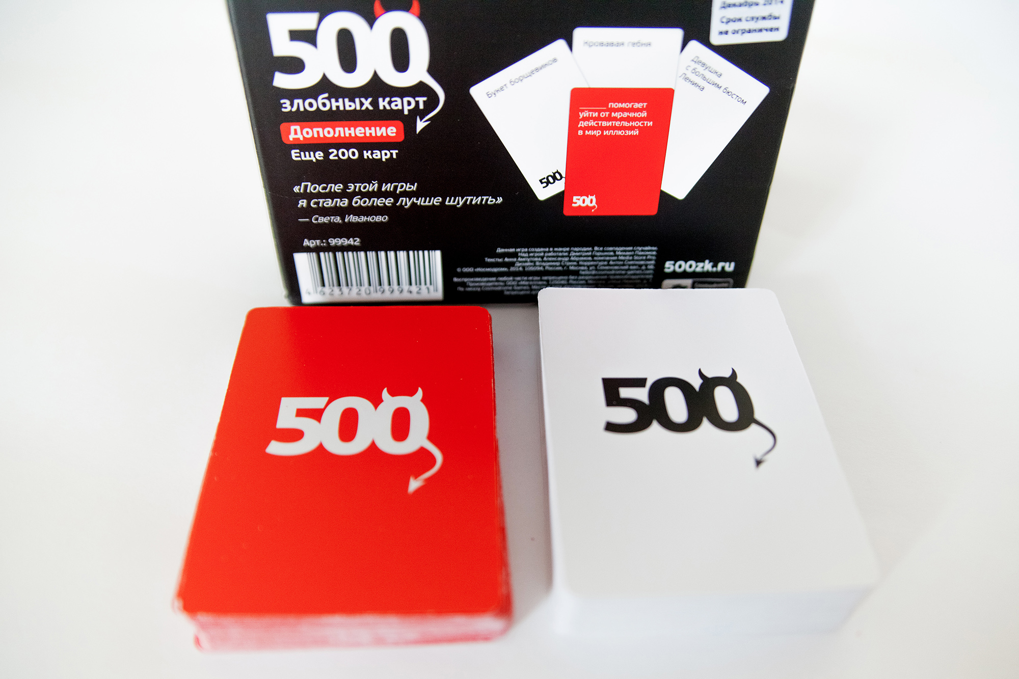 К большой радости любителей игры «500 злобных карт» производитель выпустил «Дополнение». Еще 200 карточек юмористических ответов и абсурдных вопросов. Новые злобные и жестокие фразы порадуют ваших друзей и удивят знакомых. Дополнение так же предназначено только для людей старше 18 лет и желательно обладающих хоть капелькой чувства юмора.