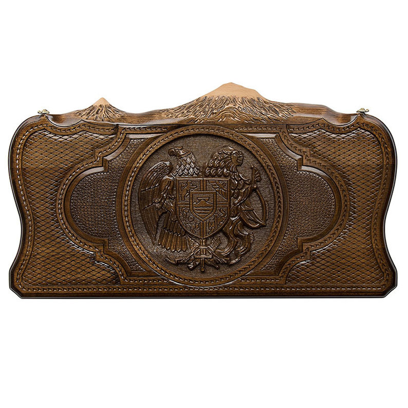 Грачия Оганян умеет радовать покупателей своей продукции новыми, удивительными игровыми поверхностями. Он всегда использует исключительно качественные материалы, аккуратно их обрабатывает, украшает изысканной резьбой и лишь потом выпускает в продажу. Нарды резные герб Армении с Араратом сразу же удивляют внешней красотой, чем разительно отличаются от привычных игральных поверхностей.