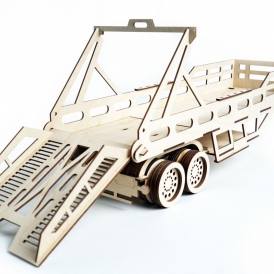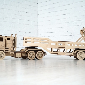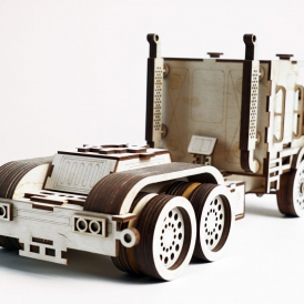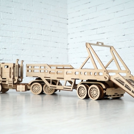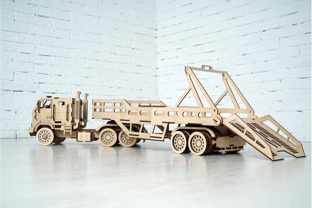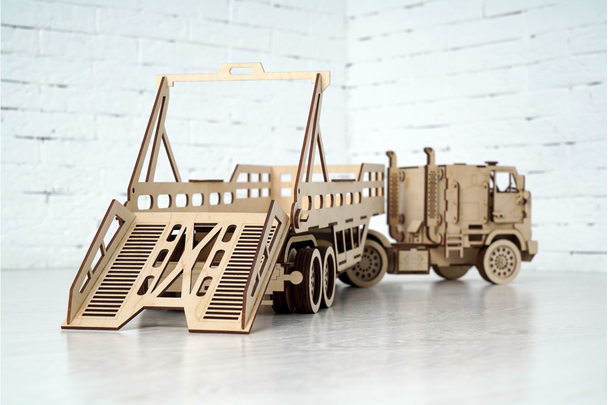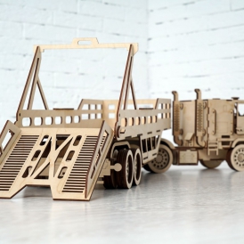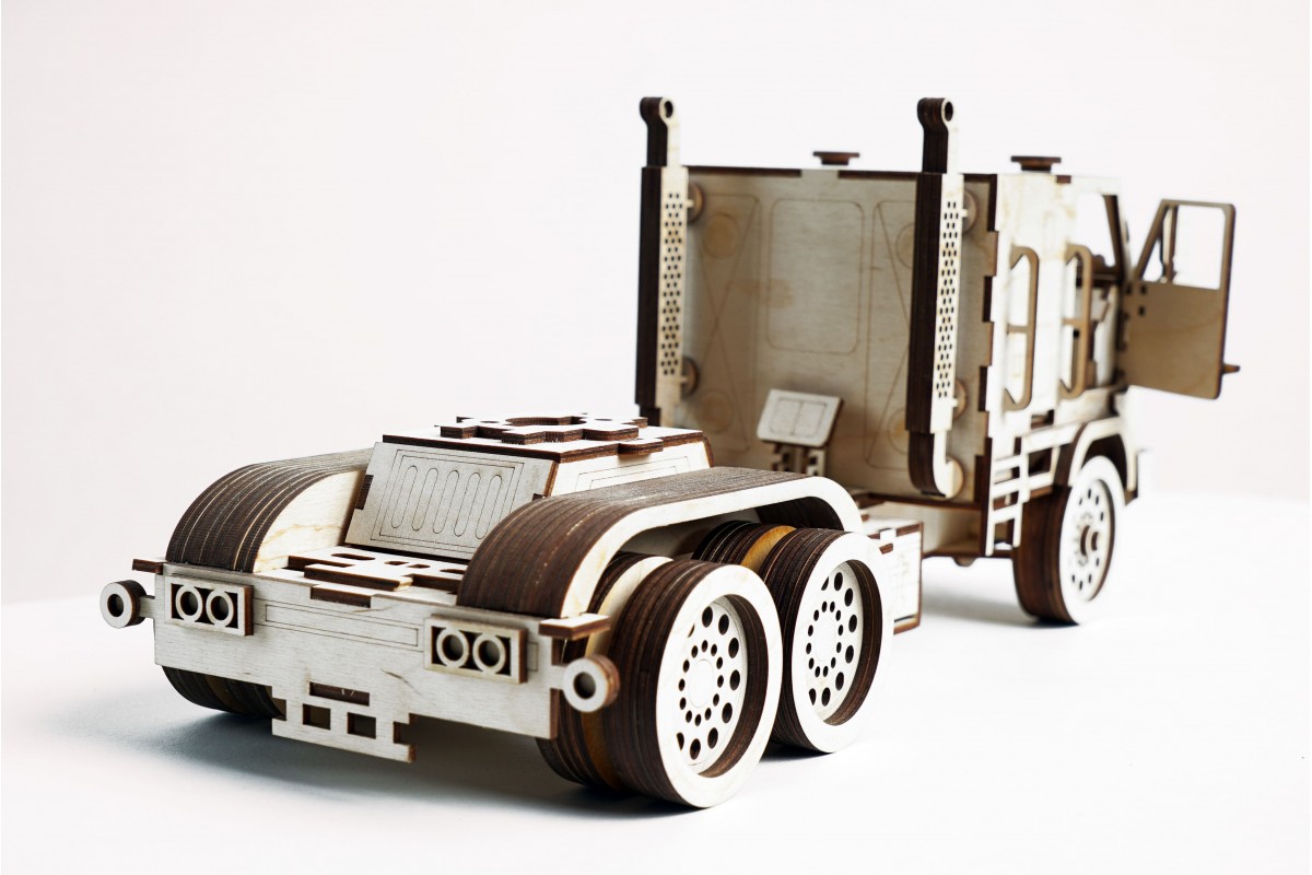 У собранной модели деревянного конструктора открываются двери кабины и опускается погрузочный мост.