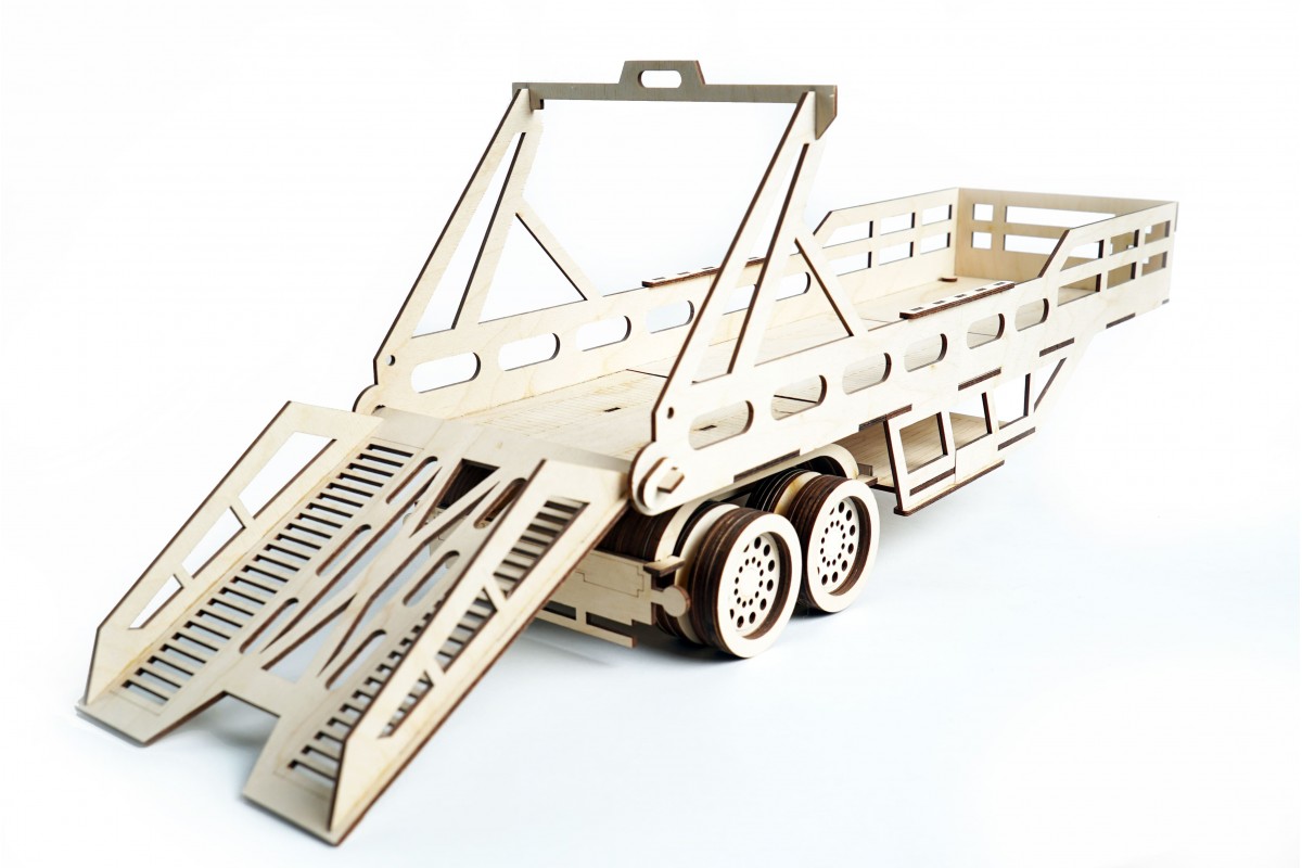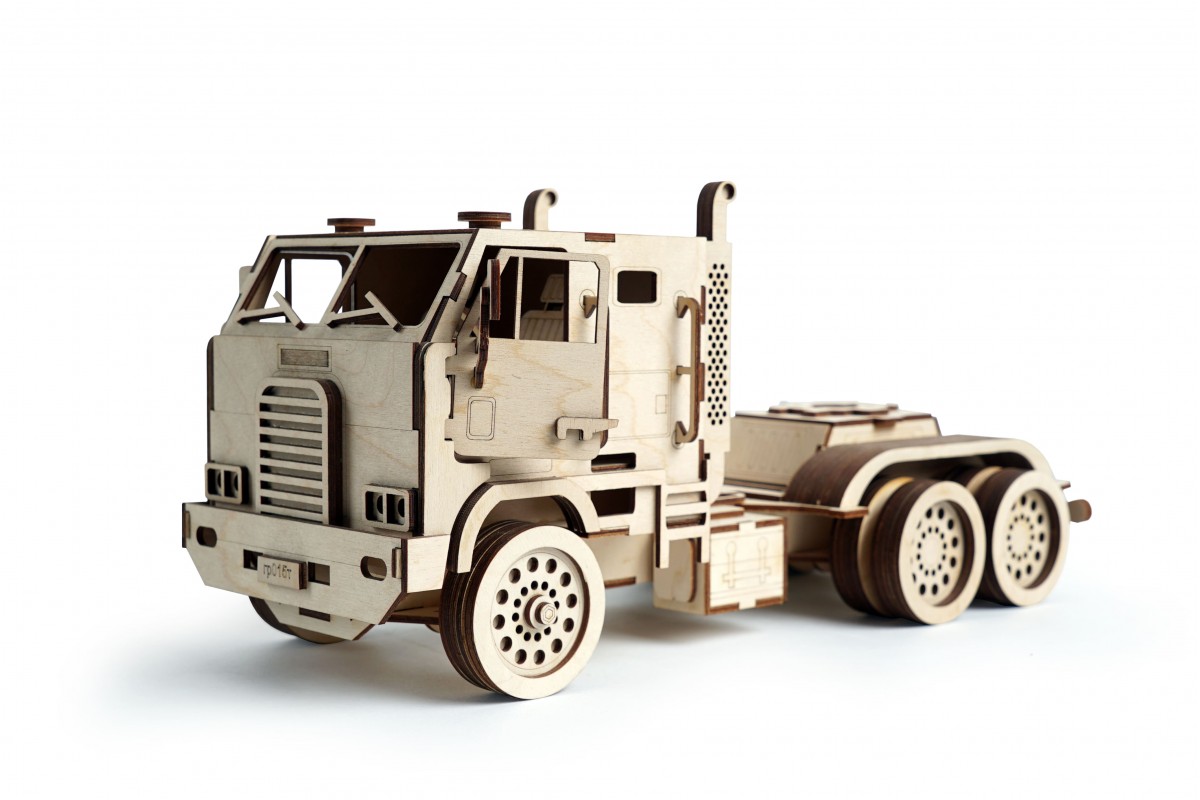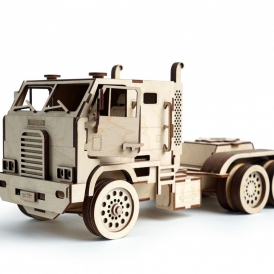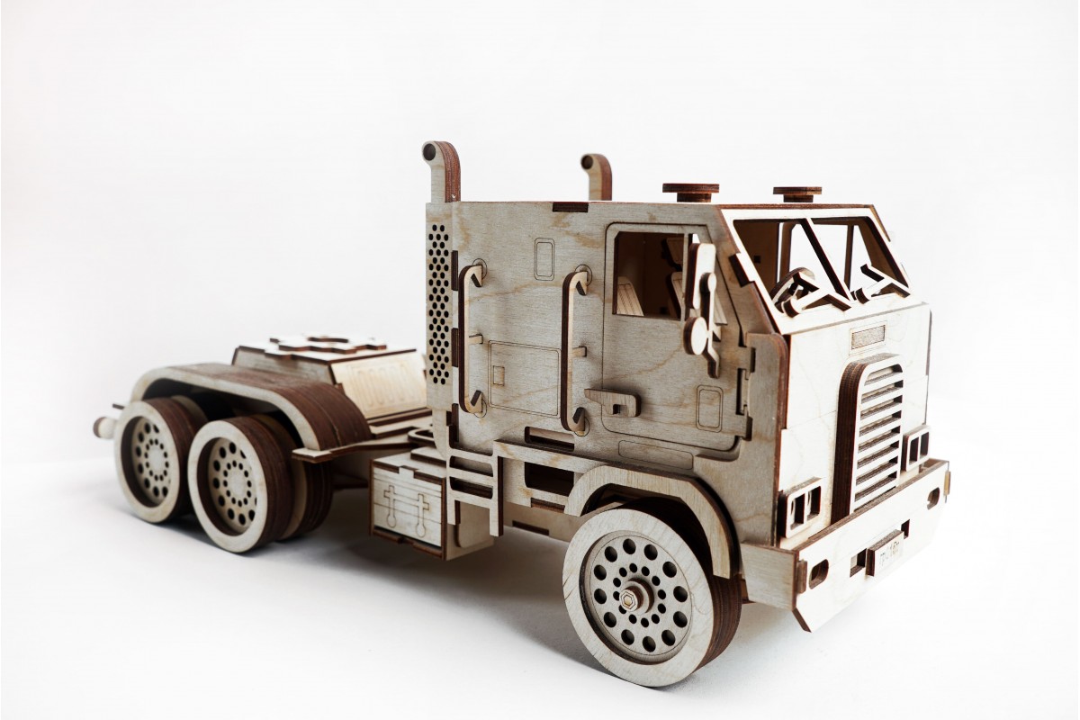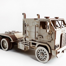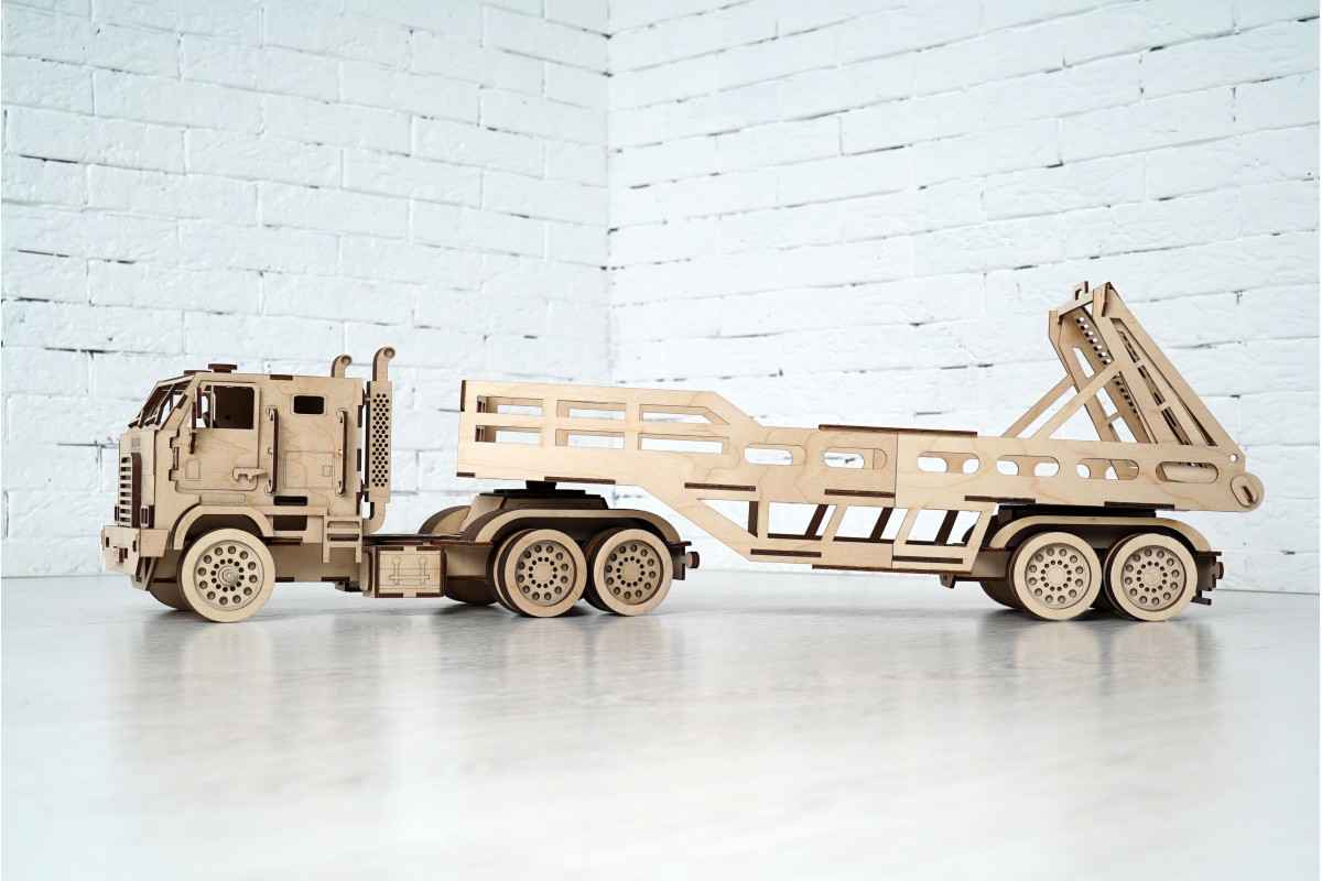 У собранной модели деревянного конструктора открываются двери кабины и опускается погрузочный мост.