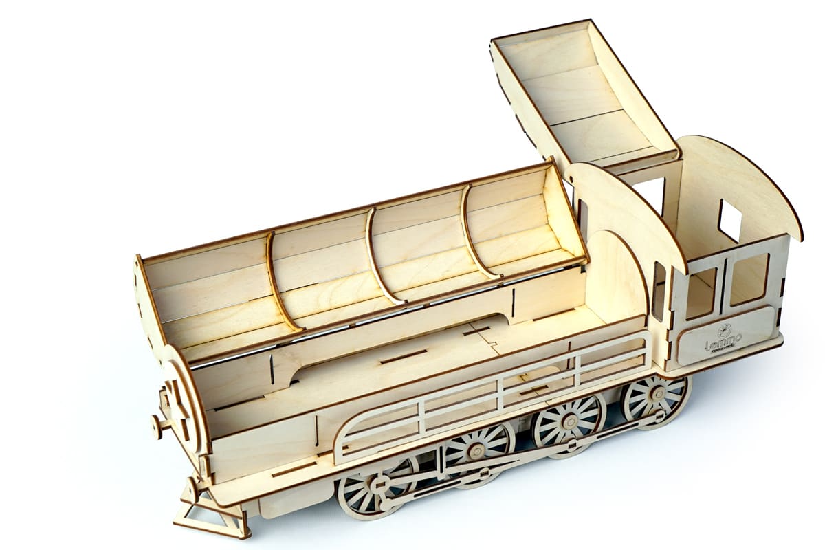 У собранной модели конструктора из фанеры открывается отсек основания и крышка кабины машиниста. Можно использовать, как пенал или использовать, как подарочную коробку и подарить коллеге или начальнику. Такой предмет интерьера всегда привлечет внимание гостей.