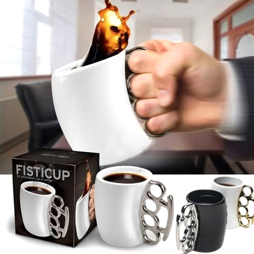 Стильная кружка из керамики с ручкой в виде кастета. |