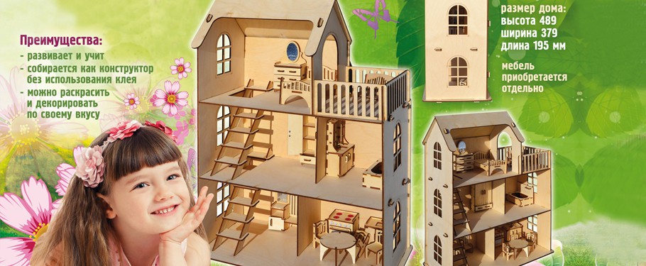 При сборке детали соединяются между собой, как конструктор в пазы. После сборки дом можно покрасить или покрыть лаком и даже поклеить обои, прекрасное "поле" для творчества.