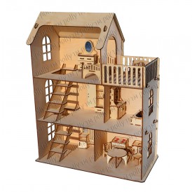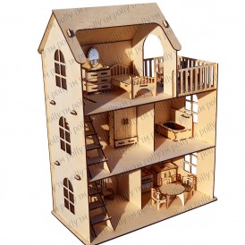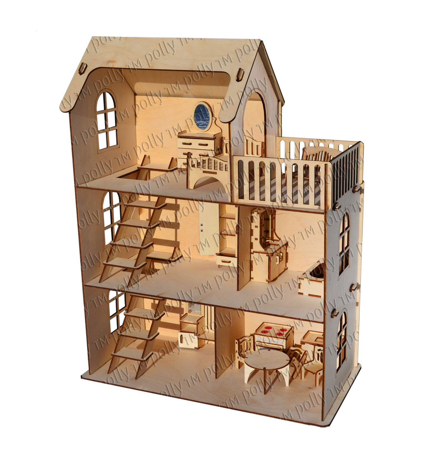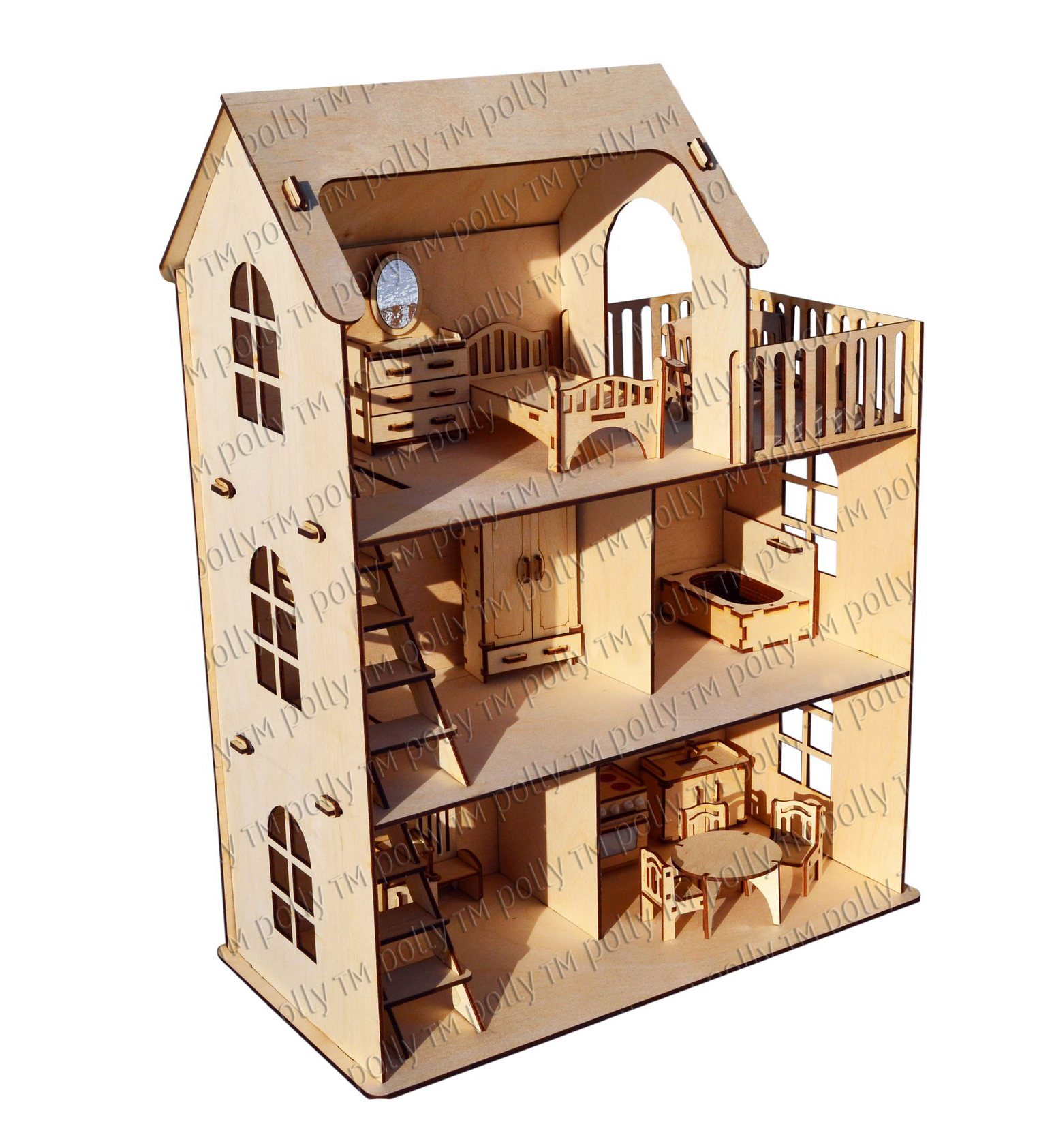 Трехэтажный домик для кукол 5 небольших комнат. Для любителей light стиля. Достаточно места, чтобы расставить мебель по своему желанию. Внутри есть лестница.