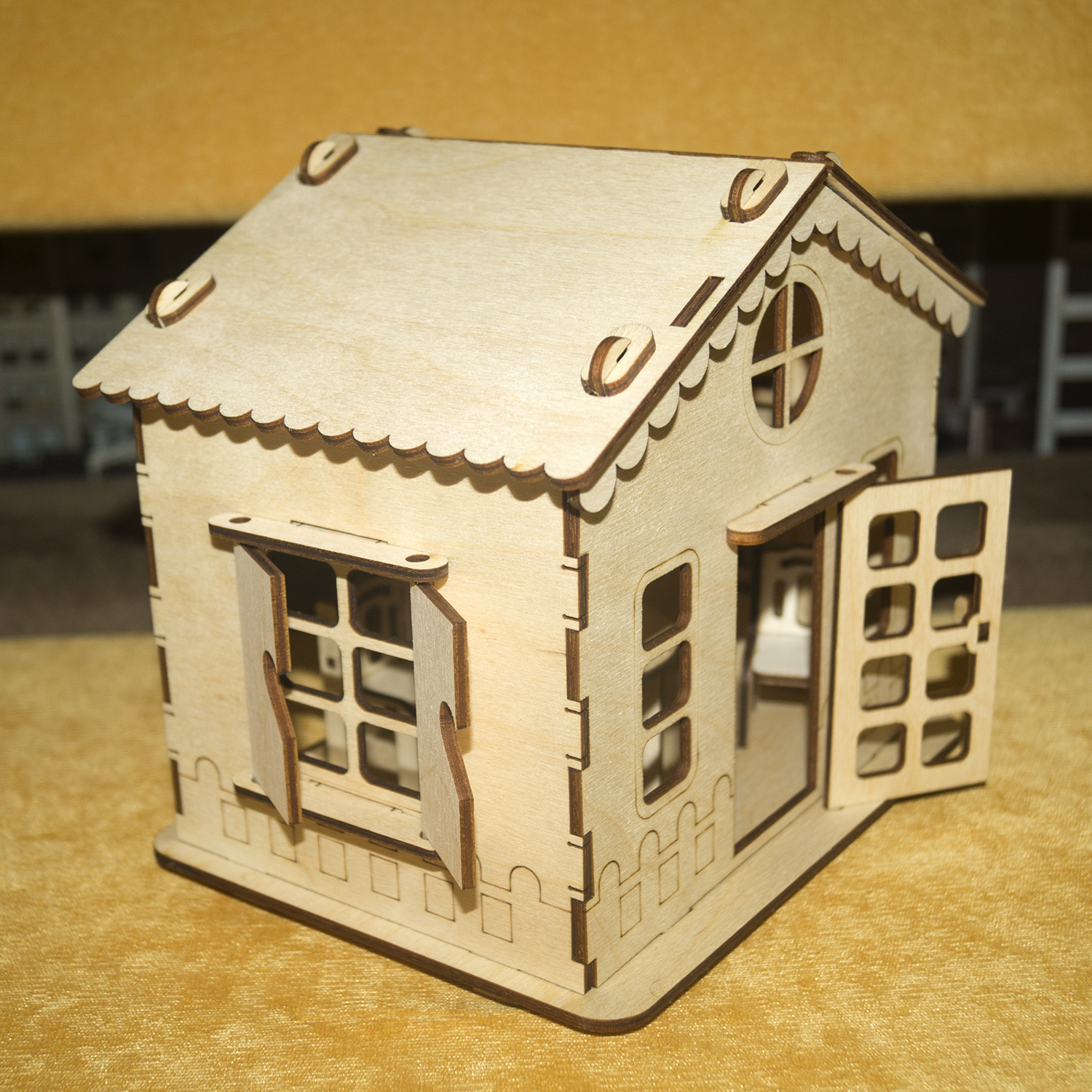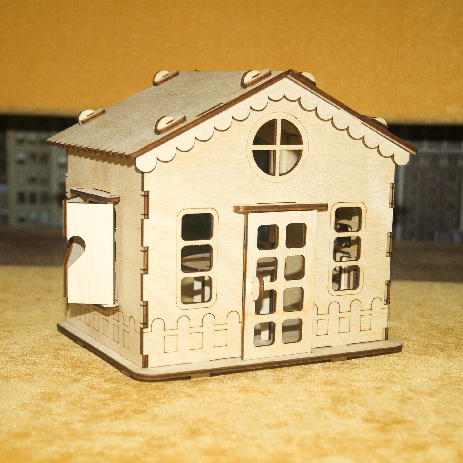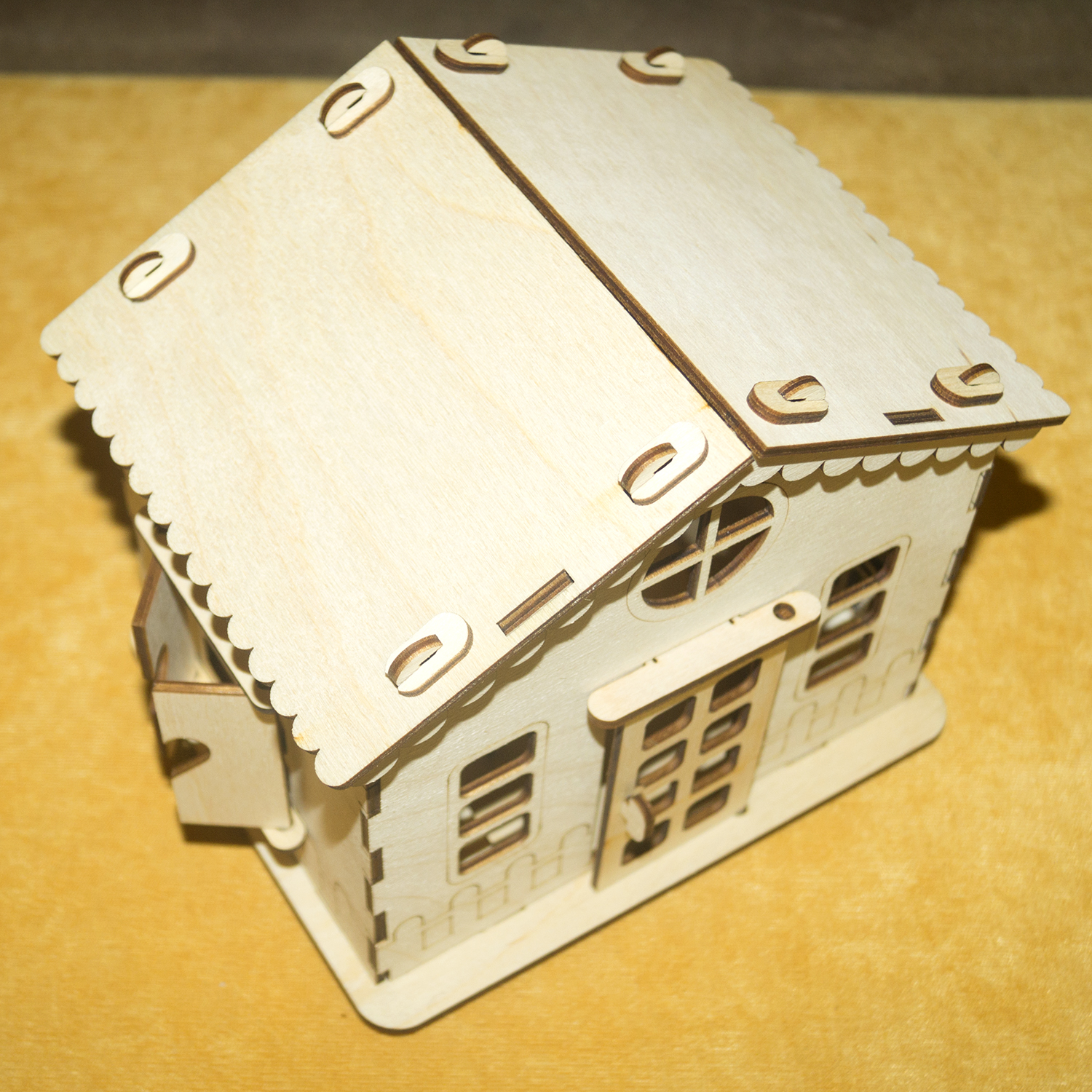 При сборке детали соединяются между собой, как конструктор в пазы. После сборки дом можно покрасить или покрыть лаком и даже поклеить обои, прекрасное "поле" для творчества. Состоит из абсолютно безопасных материалов для детей. Детали вырезаны лазером, ровные края.