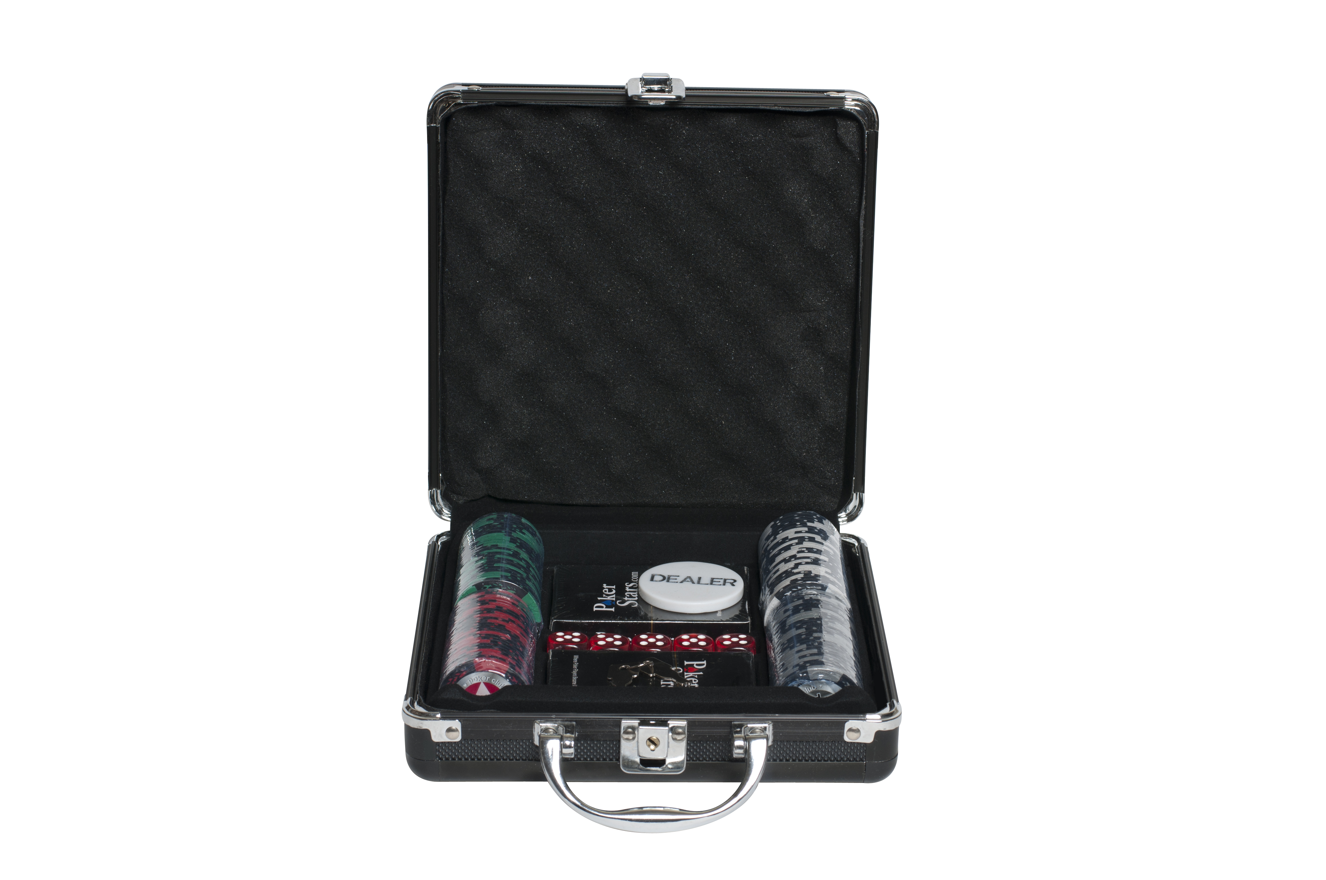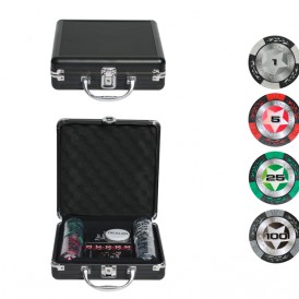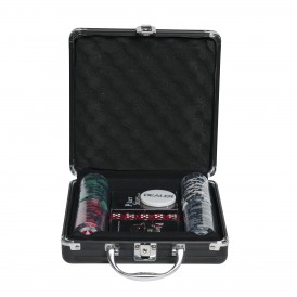 Долой скучное времяпрепровождение! Представляем Вашему вниманию набор для игры в покер Black Stars на 100 фишек, который разнообразит Ваш досуг и соберёт лучших друзей за круглым столом. В красивом стальном кейсе аккуратно сложено всё, что необходимо для достойно проведённой игры: фишка дилера, яркие фишки номиналами 1, 5, 25 и 100, 2 колоды 100% пластиковых карт, а также игральные кости. Данный покерный набор имеет отличный размер, что позволяет брать его с собой в гости или поездки.