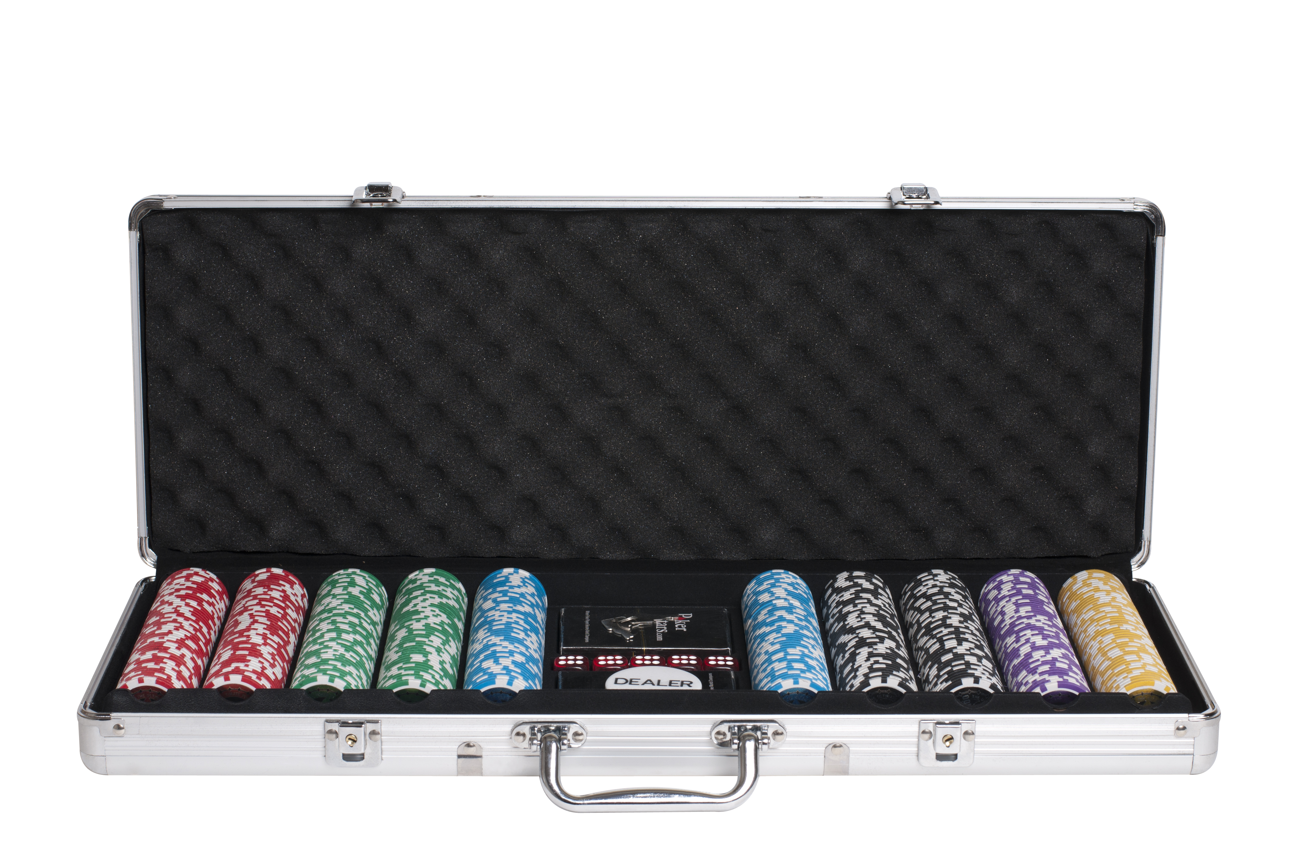 Этот набор для покера на 500 фишек станет отличным решением для вас, если вы любите получать оптимальное качество. Здесь вы найдете фишки с различными номиналами (от 5 до 1000), фишку дилера, игральные кости, а также 2 колоды карт отличного качества из 100% пластика.
