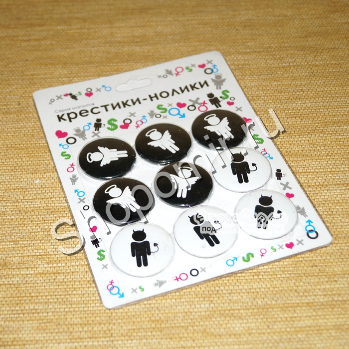 Забавные магнитики в черно-белом исполнении наверняка станут изящной изюминкой даже самого скромного и лаконичного дизайна кухни и способом общения между домашними. Ведь на каждом круглом изделии изображены ангелы и чертики, оттого и название набор магнитиков имеет «Ангел vs Чертик».