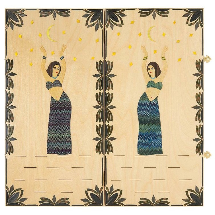 Украшена она рисунком, выполненным методом инкрустации. С внешней стороны красуется изображение девушки, танцующей индийский танец под светом луны и звезд. Обратная сторона створок более классическая – ячейки подчеркнуты прямыми линиями, а в центре – запутанный узор.