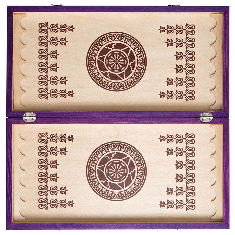 Нарды малые фиолетовые представляют собой яркого, в прямом смысле, представителя недорогих моделей. Хотя назвать ее простой тяжело, ведь внешнее оформление сразу привлекает взгляд. На внутренние стороны створок нанесен красивый узор, позволяющий отвлечься во время партии. Материалом изготовления служит береза, поэтому получается достаточно прочной, чтобы выдерживать напряженные баталии. Сверху она покрыта слоем лака, который улучшает защиту от влаги. Но мы не рекомендуем мыть их под проточной водой.