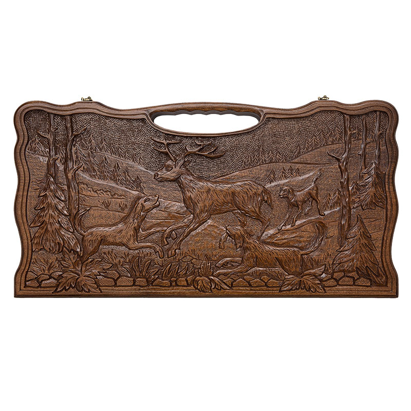 Все поверхности доски украшается резьбой, выполненной собственными руками мастера по старинной технологии, без использования механизмов. На лицевой стороне изображен фрагмент охоты, где собаки нападают на оленя. С противоположной стороны имеется поле для игры в шашки, размером 8х8 клеток. Изнутри каждая ячейка отдельно оформляется мелким узором, а по центру расположился крупный символический цветок. Петли фирменные с гравировкой эмблемы производителя. Имеется ручка, вырезанная непосредственно в древесине.