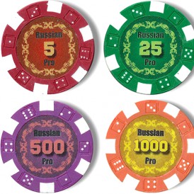 Фишки с номиналом. Фишки изготовлены из композитного пластика, с металлическим сердечником внутри. Крупный номинал на стикере. В состав входит: набор покерных фишек 300 шт (1-50шт., 5-100шт., 25-100шт., 50-25шт., 100-25шт), 2 колоды карт, 5 кубиков, 2 ключа, фишка дилера. Набор упакован в картонную коробку.