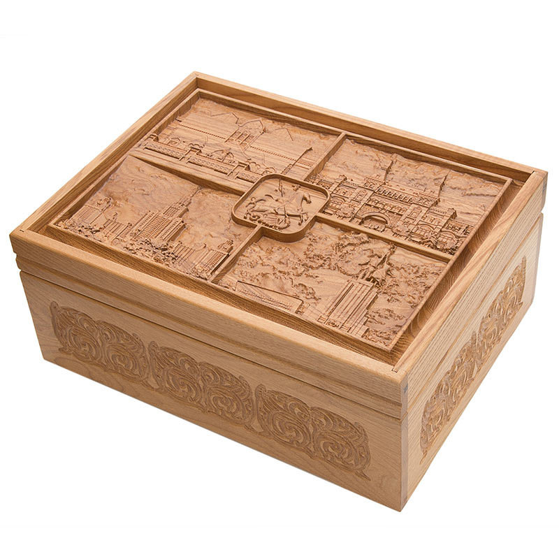 Сама шкатулка выполняется из прочного и долговечного ясеня, тщательно обработанного и украшенного изысканной резьбой. На лицевой панели, она же крышка, вырезано изображение памятников и строений, причем сделано это нас качественно, что можно разглядеть даже мельчайшие изгибы. С других сторон – все менее изысканно, однако мелкий узор также заслуживает внимания, ведь не каждый день встретишь такое. Бочонки также деревянные, поэтому можете не переживать за их сохранность, если случайно не уронить их в воду. Карточки выполнены из плотного картона, также способного выдержать сотни партий. Комплект для игры в домино стандартного белого цвета, с нанесением черных точек, поэтому напрягаться, чтобы их увидеть не придется.