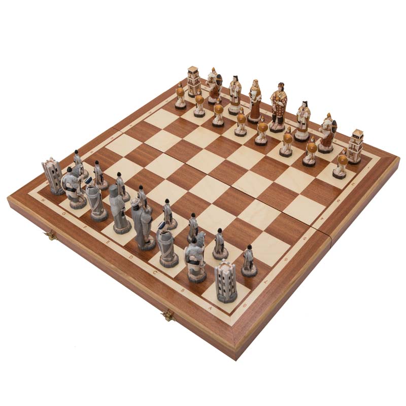 Сама доска достаточно обычная – выполнена из 2 деревянных створок, соединенных петлями, а для закрывания используется крючок. Гораздо большее внимание было уделено внешнему виду фигурок, которыми предстоит играть. Комплект так и называется Шахматы Англия, потому что тут противостоят друг другу 2 армии англичан. В «войне» участвуют короли, лорды, защитные башни, простые солдаты с щитом и мечом, крестоносцы.