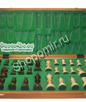 Материал: клен, красное дерево, береза. Высота короля - 9,5см, диаметр - 3,4см. Высота пешки - 4,5см, диаметр - 2,6см. Шахматная доска в разложенном виде: 52х52х3 см Клетка на поле - 6х6 см |
