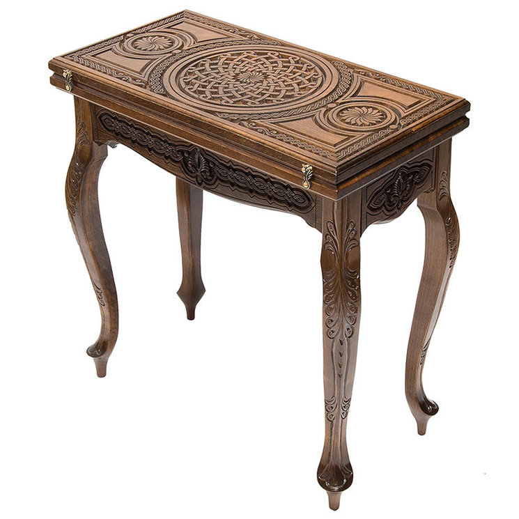 Удобный, надежный, красивый, доступный – вот преимущества Стол ломберный Нарды Армянский узор 3. Приобретая его, вы не будете думать – куда убирать каждый раз после игры, ведь он впишется в любой интерьер и придаст ему более изысканный внешний вид. Выполнен он в темном, благородном цвете, а оформление выполняется полностью ручным способом, без использования современных механизмов. Делается руками известного мастера Карена Халеяна, который уже долгое время занимается изготовлением досок для настольных игр. Каждому изделию уделяется особое внимание – обработка поверхностей, детали оформления и все остальное.